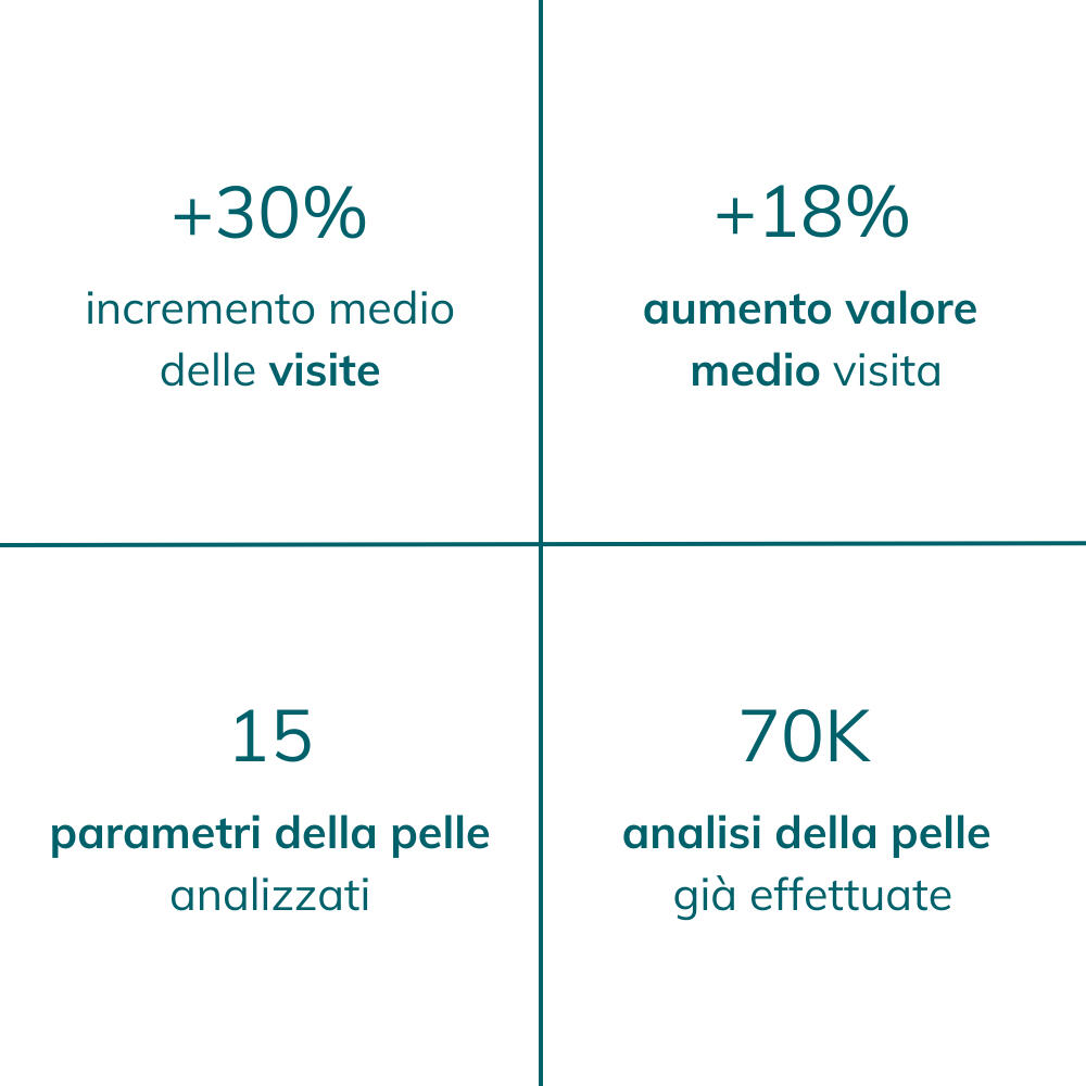 Offri ai tuoi clienti l'unica tecnologia di analisi della pelle creata grazie al supporto di farmacisti e dermatologi in Italia.Mentre le cliniche di medicina estetica concorrenti offrono consulenze standardizzate, tu diventi il punto di riferimento per l'innovazione, posizionandoti come clinica all'avanguardia.